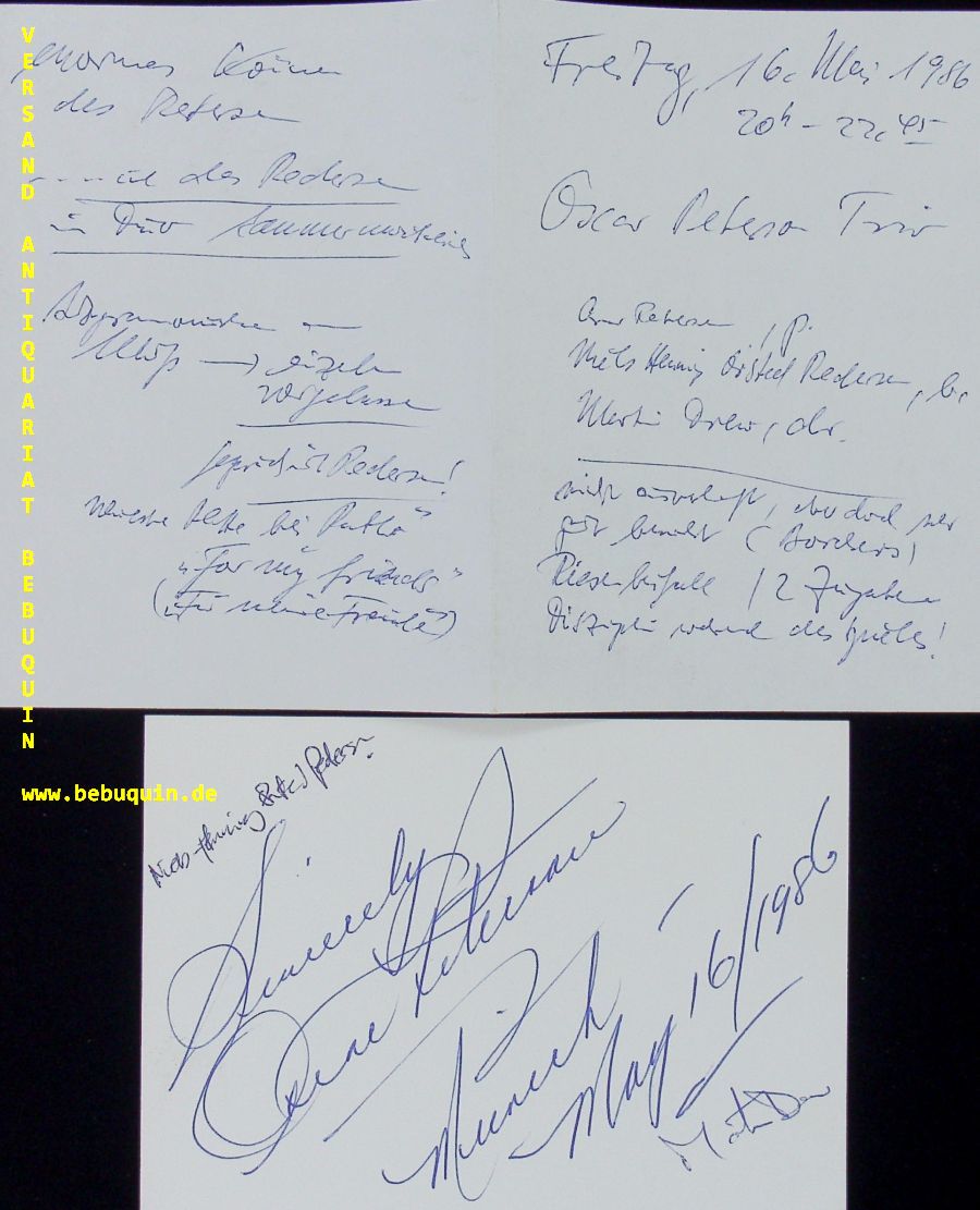 JAZZ.– PETERSON, Oscar (Pianist): eigenhändig signierte und datierte Autogrammkarte. München, 16.5.1986. 10,5 x 14,5 cm. große Karteikarten mit Beiblatt. Oscar Emmanuel Peterson (* 15. August 1925 in Montréal; † 23. Dezember 2007 in Mississauga) war ein kanadischer Jazz-Pianist und -Komponist. Duke Ellington nannte ihn den „Maharaja der Tasten“. Er veröffentlichte über 200 Aufnahmen, gewann sieben Grammys und zahlreiche weitere Auszeichnungen in seiner Karriere. Er wird als einer der erfolgreichsten Jazz-Pianisten aller Zeiten angesehen, der in seiner 65-jährigen Karriere auf Tausenden Konzerten spielte. (Wikipedia)