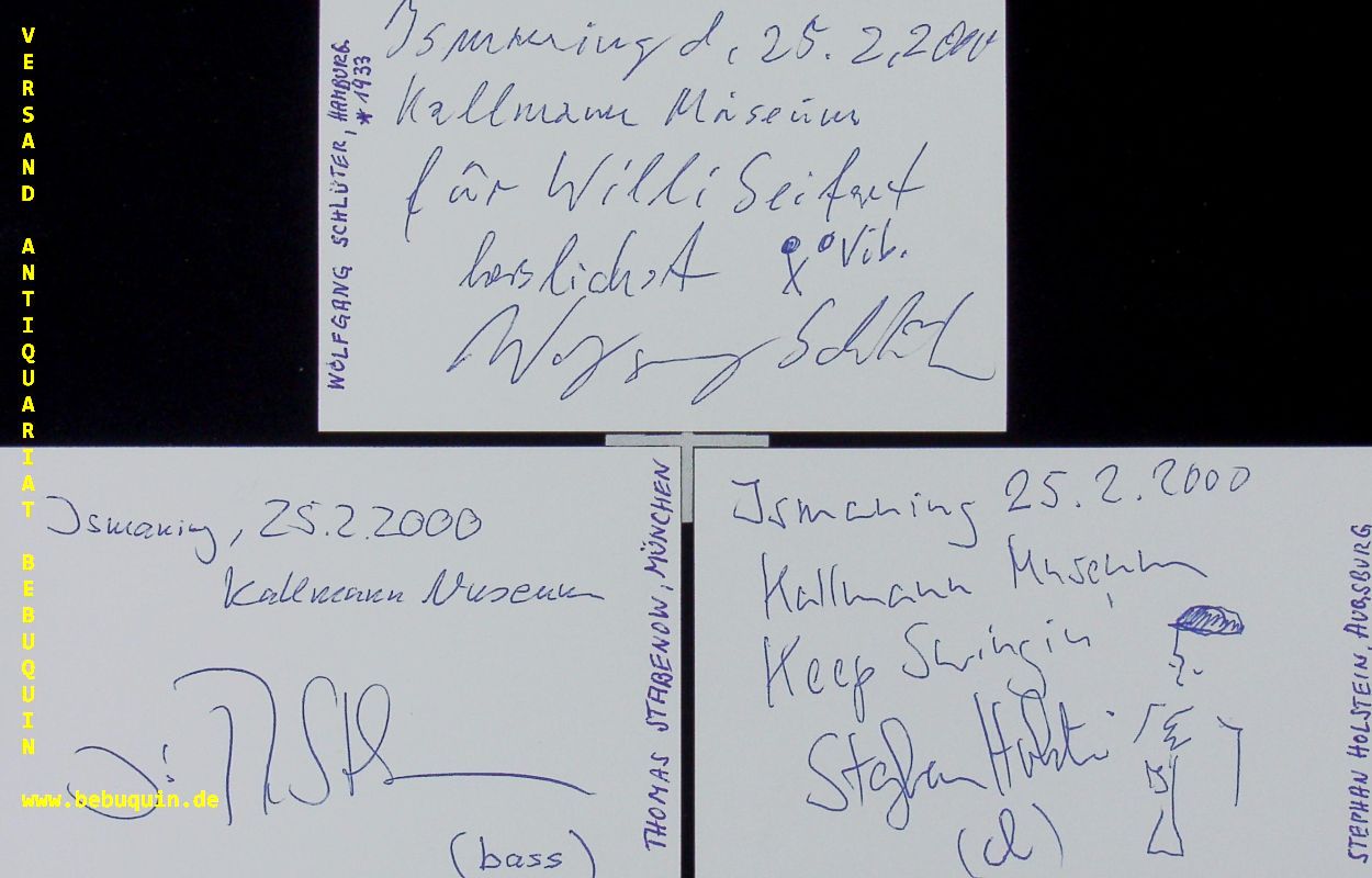 JAZZ.– SCHLÜTER, Wolfgang (Vibraphonist)+ HOLSTEIN, Stephan (Klarinettist) + STABENOW, Thomas (Bassist): 3 eigenhändig von allen signierte und datierte Autogrammkarten. Ismaning (Kallmann), 25.2.2000. 8 x 12,5 cm. 3 Karteikarten mit Einladung. Wolfgang Schlüter (* 12. November 1933 in Berlin; † 12. November 2018[1]) war ein deutscher Jazzmusiker. Er spielte Vibraphon und Perkussion und gehörte zu den wichtigen Vibraphonisten seiner Generation in Europa. Als einer von wenigen deutschen Jazzmusikern neben Albert Mangelsdorff konnte er sich im renommierten Kritiker-Poll des US-Fachmagazins „Down Beat“ platzieren. Stephan Holstein (* 1963 in Tübingen) ist ein deutscher Jazzmusiker (Klarinette, auch Saxophon). Thomas Stabenow (* 11. September 1952 in Kirchberg an der Jagst) ist ein deutscher Bassist des Modern Jazz. (Wikipedia)