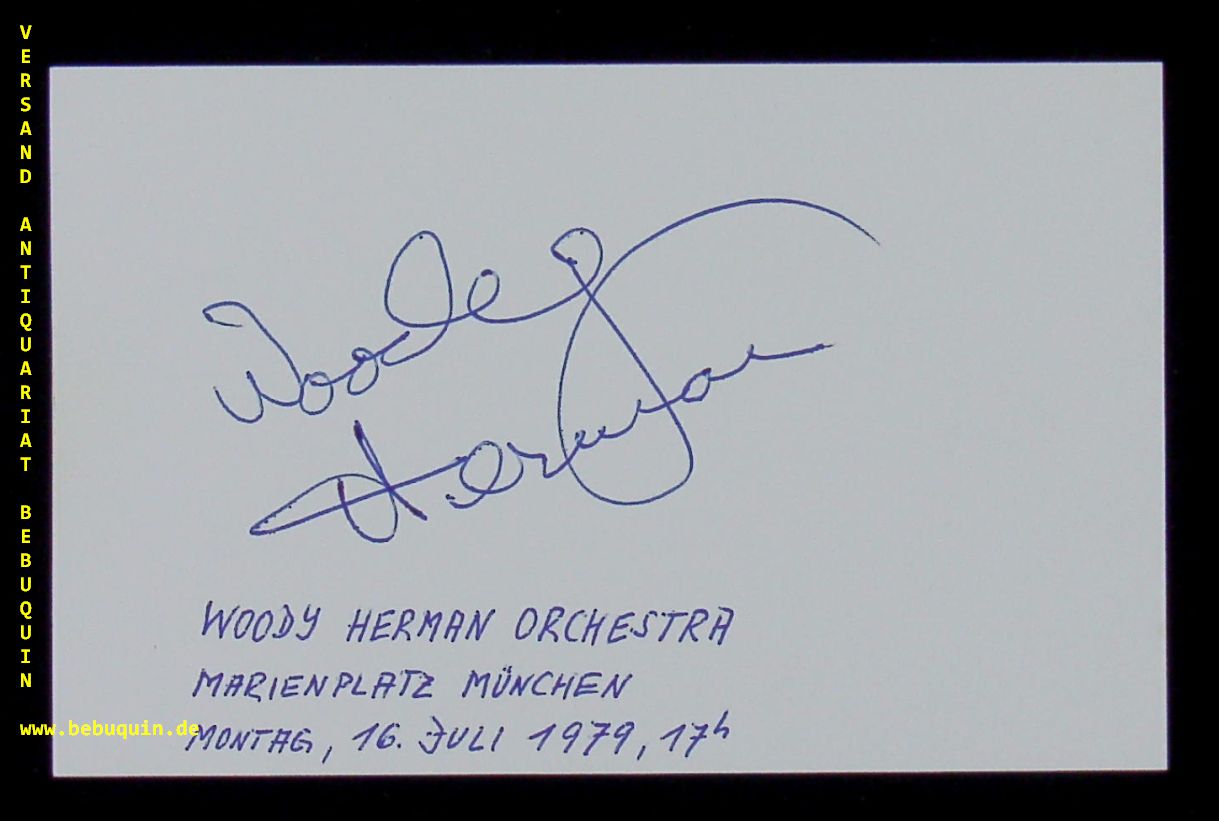 JAZZ.– HERMAN, Woody ( Klarinettist): eigenhändig signierte Autogrammkarte. München (Marienplatz), 16.7.1979. 8 x 12,5 cm. Karteikarte mit Programmausschnitt. Woody Herman (eigentlich Woodrow Charles Thomas Herman; * 16. Mai 1913 in Milwaukee, Wisconsin; † 29. Oktober 1987 in Los Angeles, Kalifornien) war ein US-amerikanischer Jazz-Klarinettist, Sänger und Bandleader. (Wikipedia)
