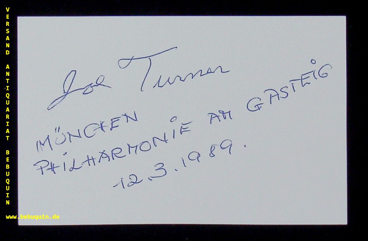JAZZ.– TURNER, Big Joe (Pianist): eigenhändig signierte Autogrammkarte München (Philharmonie), 12.3.1989 8 x 12,5 cm. Karteikarte. Joseph H. „Joe“ Turner (* 3. November 1907 in Baltimore, Maryland; † 21. Juli 1990 in Paris) war ein US-amerikanischer Jazzpianist und Sänger. Er wurde bekannt, als er in der New Yorker Jazzszene der 1920er Jahre als Stride-Pianist auftrat und mit Jimmy Harrison und June Clark arbeitete; 1928 gehörte er der Band von Benny Carter an, in den 30er Jahren begleitete auch er die Sängerin Adelaide Hall und spielte mit Louis Armstrong. Ende der 30er arbeitete er in Europa; bei Ausbruch des Zweiten Weltkriegs kehrte er in die Vereinigten Staaten zurück und leistete seinen Militärdienst ab. Nach Kriegsende arbeitete er erneut in Europa und gastierte in den 1950er Jahren mit Bill Coleman und Albert Nicholas auch in Deutschland. Er lebte zunächst in Ungarn, dann in der Schweiz und zuletzt ab 1962 in Paris. In den 70ern entstanden Aufnahmen mit Slam Stewart, Jo Jones und Panama Francis für das Label Black & Blue; in den 1980er Jahren nahm er erneut für verschiedene amerikanische Label auf und hatte in seinem Heimatland einige Auftritte. (Wikipedia)