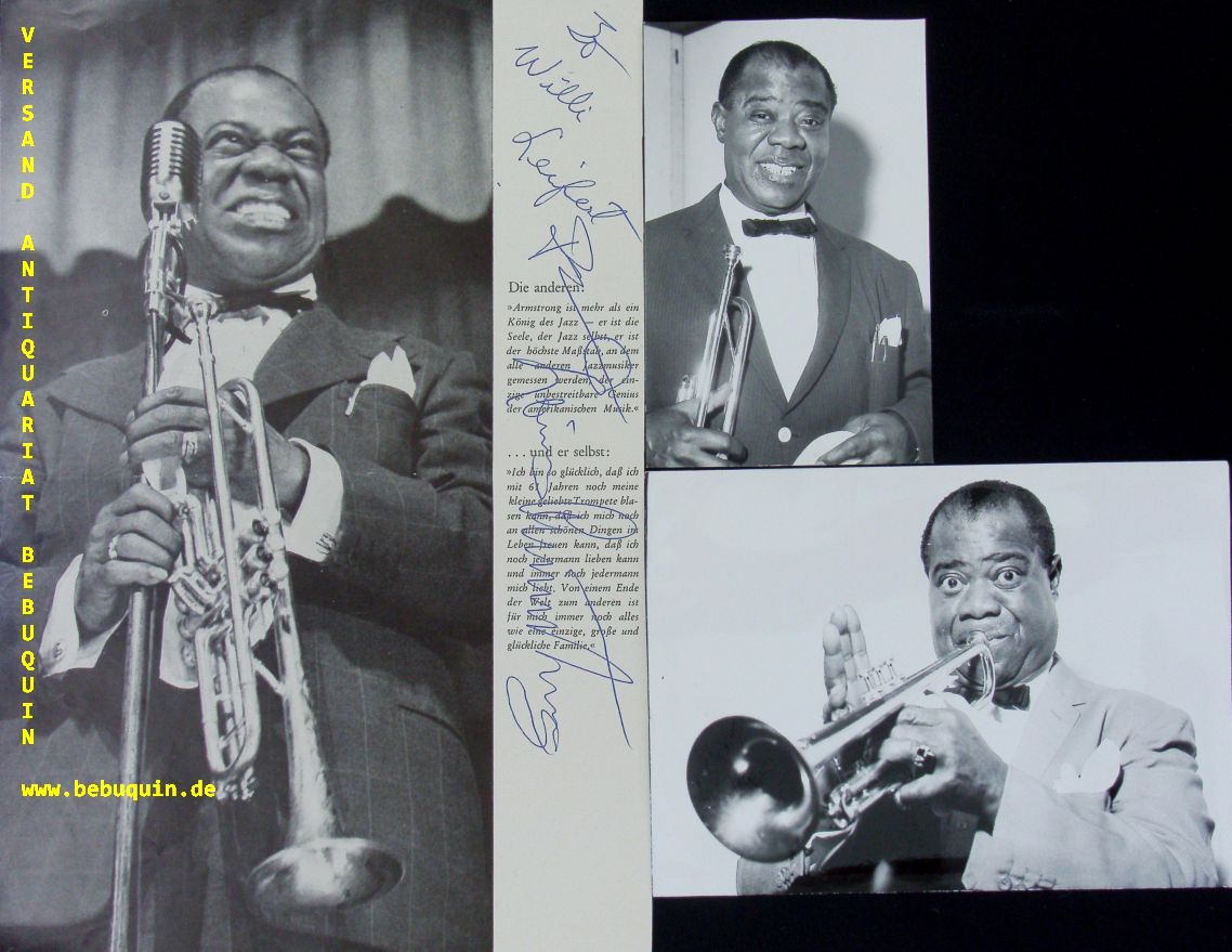 JAZZ.– ARMSTRONG, Louis (Trompeter): eigenhändig signiertes Großfoto mit persönlicher Widmung an Willi Seifert. München, 1962. 29 x 20 cm s/w Zeitschriftausschnitt. Dabei 2 Original s/w Fotos aus der Zeit. Louis Daniel „Satchmo“ Armstrong (* 4. August 1901 in New Orleans; † 6. Juli 1971 in New York City) war ein amerikanischer Jazztrompeter, Sänger und Schauspieler. (Wikipedia)