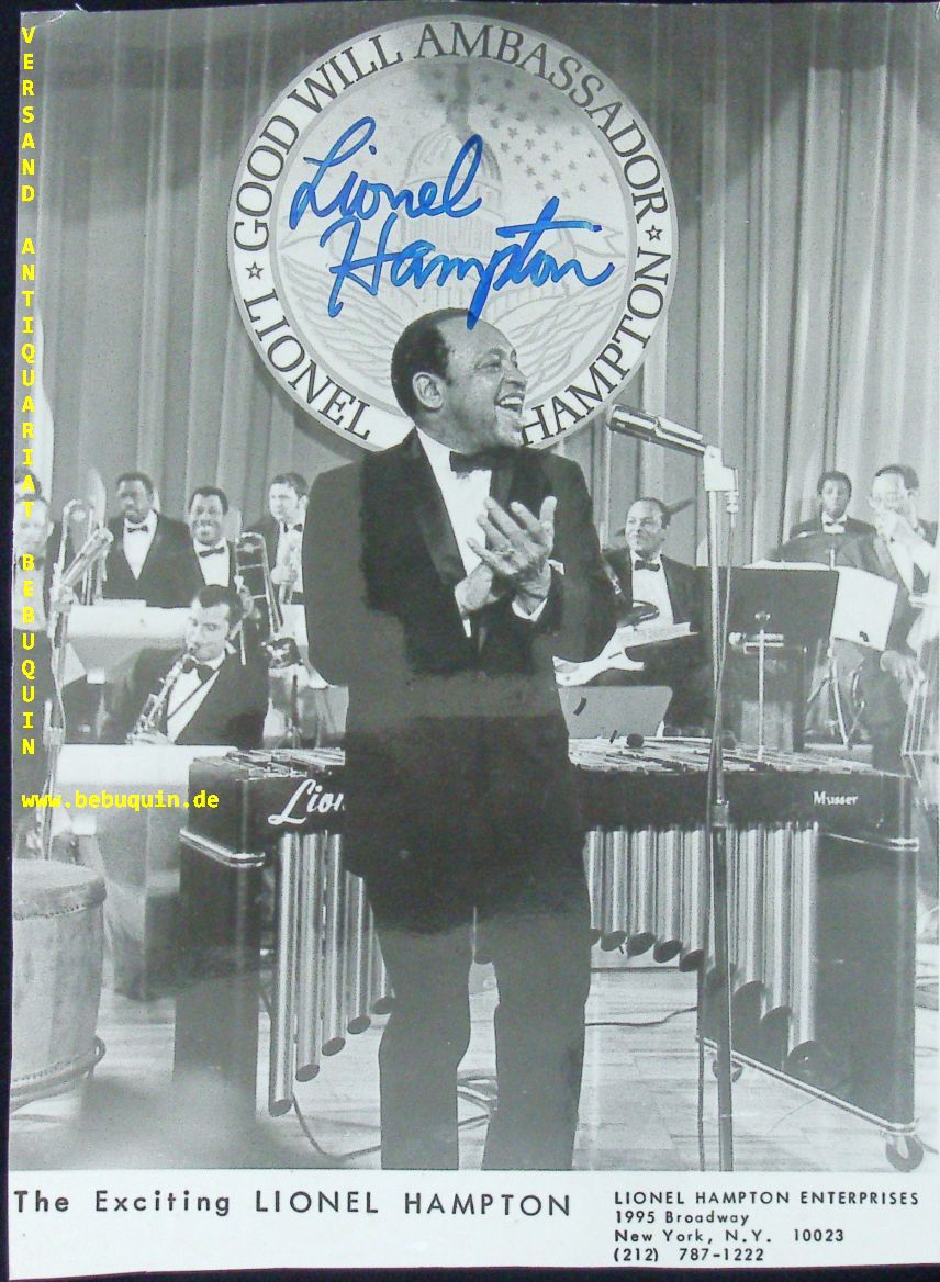 JAZZ.– HAMPTON, Lionel (Vibraphonist): eigenhändig signiertes Auftrittsfoto „The Exciting Lionel Hampton“. New York, o.J. 24 x 17,5 cm. Das berühmte Foto mit der Signatur über dem Kopf. Rand beschnitten Lionel „Hamp“ Hampton (* 20. April 1908 in Louisville, Kentucky; † 31. August 2002 in New York) war ein US-amerikanischer Jazzmusiker. Er ist bekannt als Bandleader, Jazzperkussionist und Vibraphonvirtuose. Hampton zählt zu den berühmtesten Namen der Jazzgeschichte und arbeitete mit prominenten Jazzmusikern wie Benny Goodman, Charlie Parker und Quincy Jones zusammen. (Wikipedia)
