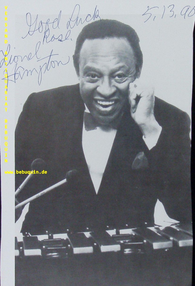 JAZZ.– HAMPTON, Lionel (Vibraphonist): eigenhändig signiertes Zeitungsfoto. München, 13.5.1990. 19 x 13 cm. Aus der Worldtour 1990. Rand beschnitten