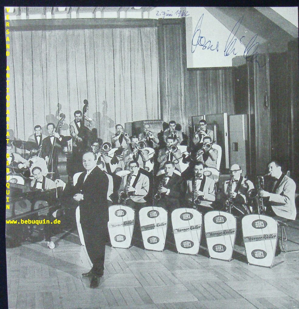 JAZZ.– MÜLLER, Werner: eigenhändig signierter Zeitungsausschnitt. München, 2.6.1962. 20 x 19 cm. Abb. mit dem RIAS Tanzorchester. anbei diverse Zeitungsausschnitte. mittig gefaltet. Werner Müller (* 2. August 1920 in Berlin; † 28. Dezember 1998 in Köln) war ein deutscher Autor, Komponist, Dirigent, Arrangeur und Orchesterleiter. Er arbeitete auch unter den Pseudonymen Heinz Buchholz, Heinz Ullmer, Ricardo Santos. (Wikipedia)