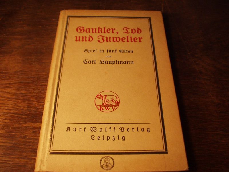 HAUPTMANN, Carl: Gaukler, Tod und Juwelier. Spiel in fünf Akten. Leipzig (Kurt Wolff), 1917. 121 S. OPb. leicht verzogen, insgesamt gut. EA WG 49.