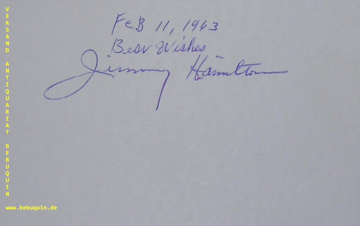 JAZZ.– HAMILTON, Jimmy (Klarinettist): eigenhändig signierte und datierte Autogrammkarte. München (Philharmonie), 11.2.1963. 8 x 12,5 cm. Karteikarte. James H. „Jimmy“ Hamilton (* 25. Mai 1917 in Dillon, South Carolina; † 20. September 1994 in Saint Croix, Jungferninseln) war ein US-amerikanischer Jazz-Klarinettist, Tenorsaxophonist, Arrangeur, Komponist, Musiklehrer. Er arbeitete 25 Jahre mit Duke Ellington. (Wikipedia)