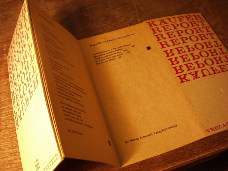 KÄUFER, Hugo Ernst: Report. Krefeld (Bulkowski), 1968. 12 Bl. Leporello. OKart. EA. Leporello 21 x 11,5 cm; aufgefaltet u. ausgeklappt 41,5 x 78 cm. Typogr. gestaltete Orig.-Pappdeckel.