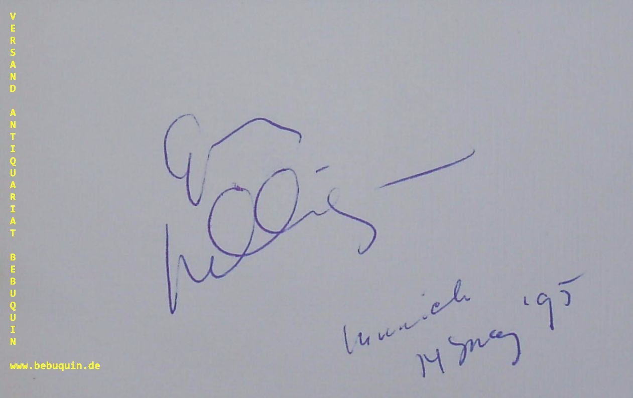 JAZZ.– MULLIGAN, Gery (Baritonsaxophonist): eigenhändig signierter und datierter Autogrammkarte. München 14.5.1995. 8 x 12,5 cm. Karteikarte. Gerald Joseph „Gerry“ Mulligan (* 6. April 1927 in Queens, New York City; † 20. Januar 1996 in Darien, Connecticut) war ein US-amerikanischer Jazzmusiker (Baritonsaxophon), Arrangeur und Komponist. Mit seinem klarinettenartigen, in Motivketten elegant perlenden und zugleich leicht anmutenden Spiel hat er dem Baritonsaxophon im Modern Jazz zur solistischen Anerkennung verholfen. (Wikipedia)