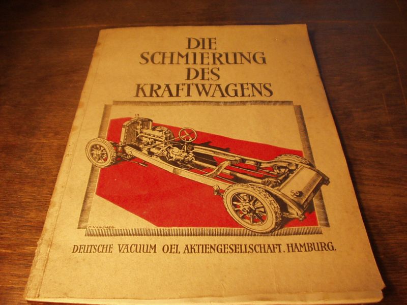 AUTO.– DIE SCHMIERUNG DES KRAFTWAGENS.– 1. Der Motor. 2. Der Unterbau. Hamburg (Vacuum Oel Aktiengeselsschaft), (1927). 4°. 51 S. mit 26 farb. Bildern. farb. ill. OKart. Einband etwas bestaubt, leicht gelockert. EA dieser seltenen frühen Schrift.