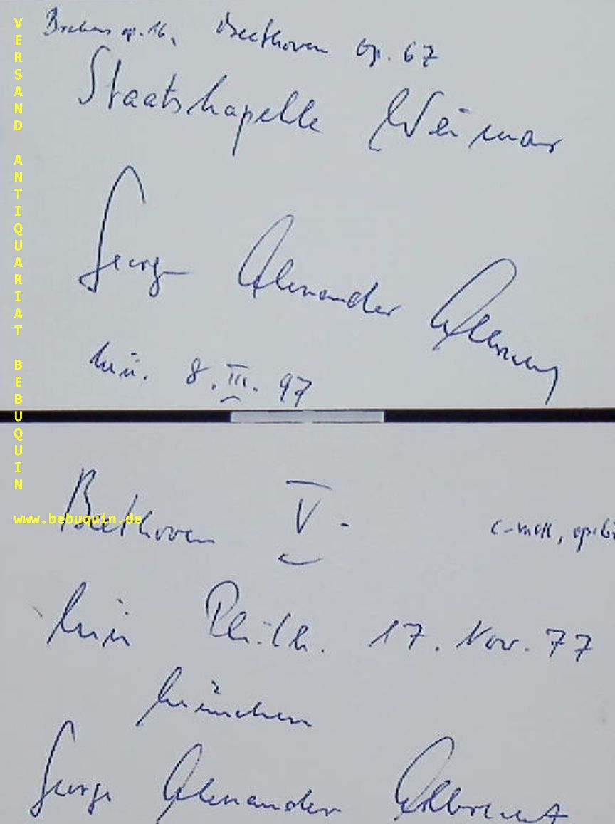 ALBRECHT, George Alexander (Dirigent): 2 eigenhändig signierte und datierte Autogrammkarte. München (Herkulessaal), 1977 + 1997. 8 x 10,5 cm. Karteikarte George Alexander Albrecht (* 15. Februar 1935 in Leuchtenburg, Landkreis Osterholz) ist ein deutscher Dirigent. (Wikipedia)