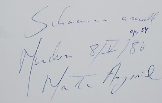 ARGERICH, eigenhändig signierte und datierte Autogrammkarte. Schumann a moll.