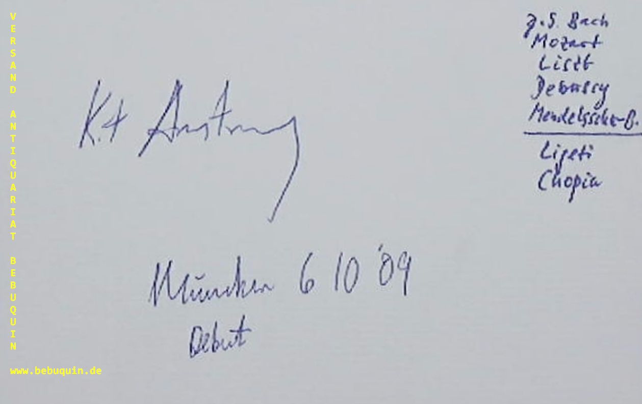 ARMSTRONG, Kit (Pianist): eigenhändig signierte und datierte Autogrammkarte. München (Herkulessaal), 6.10.1989. 8 x 12,5 cm. Karteikarte. Kit Armstrong (* 5. März 1992 in Los Angeles, Kalifornien) ist ein US-amerikanischer Pianist, Organist und Komponist. (Wikipedia)