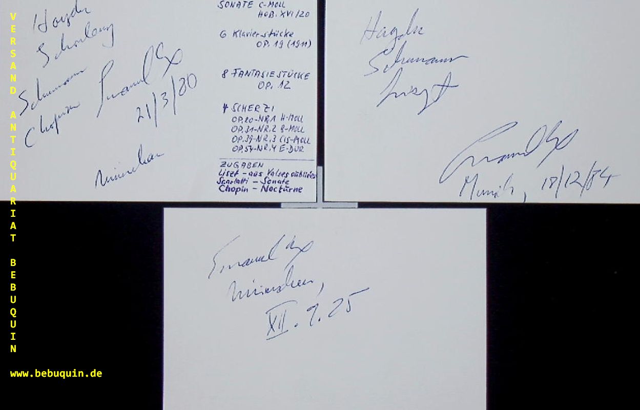 AX, Emanuel (Pianist): 3 eigenhändig signierte und datierte Autogrammkarten. München (Philharmonie), 1980 – 1985. 8 x 10,5 cm. 3 Karteikarten.