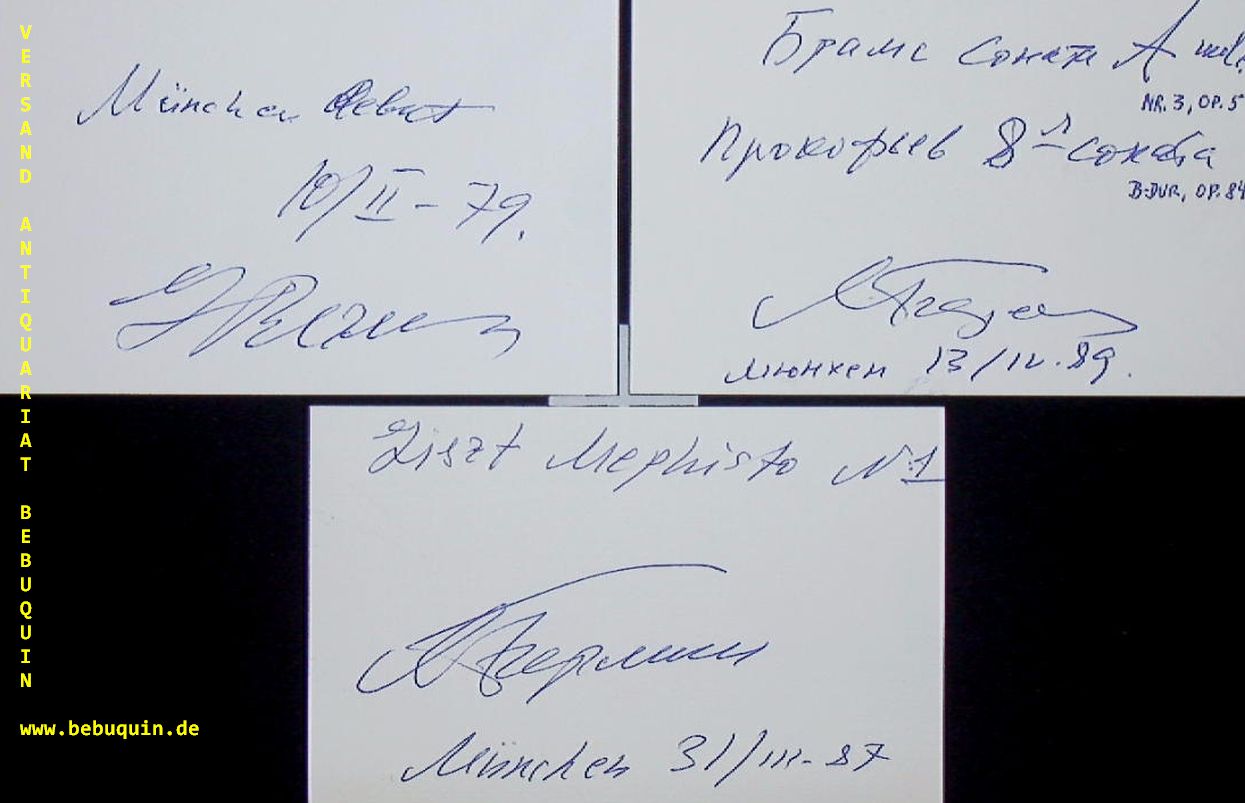 BERMANN, Lazar (Pianist): 3 eigenhändig signierte und datierte Autogrammkarten. München (Herkulessaal), 1979 – 1989. 8 x 10,5 cm. 3 Karteikarten. Lasar Naumowitsch Berman (* 26. Februar 1930 in Leningrad; † 6. Februar 2005 in Florenz) war ein russischer Pianist. (Wikipedia)