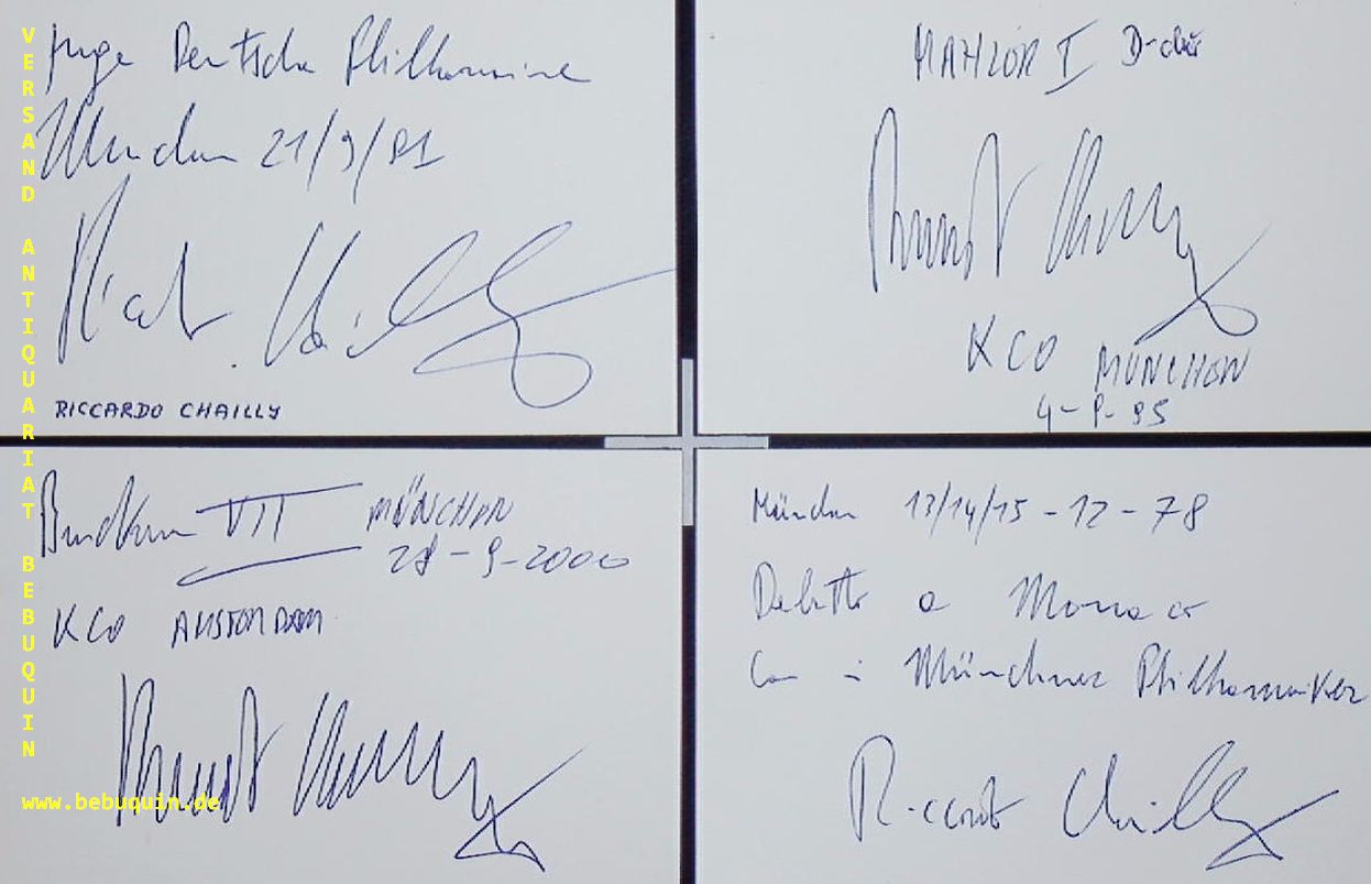 CHAILLY, Riccardo (Dirigent): 5 eigenhändig signierte und datierte Autogrammkarten. München (Philharmonie), 1978 – 2000. 8 x 12,5 cm. 5 Karteikarten. Riccardo Chailly (* 20. Februar 1953 in Mailand) ist ein italienischer Dirigent. Er ist seit 2015 Musikdirektor der Mailänder Scala. Zuvor war er von 1988 bis 2004 Chefdirigent des Concertgebouw-Orchesters in Amsterdam und von 2005 bis 2016 Gewandhauskapellmeister in Leipzig. (Wikipedia)