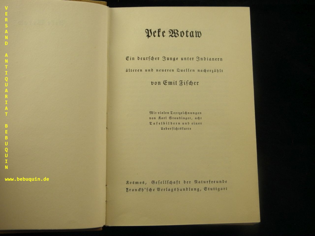FISCHER, Emil: Peke Wotaw. Ein deutscher Junge unter Indianern älteren und neueren Quellen nacherzählt. 6.– 10. Tsd. Stuttgart (Franckh), 1940. 152 S. mit zahlr. Textabb. von Karl Staudinger, 8 Tafelbildern + einer Übersichtskarte. ill. OLn. gutes Ex. Klotz 1481/2.