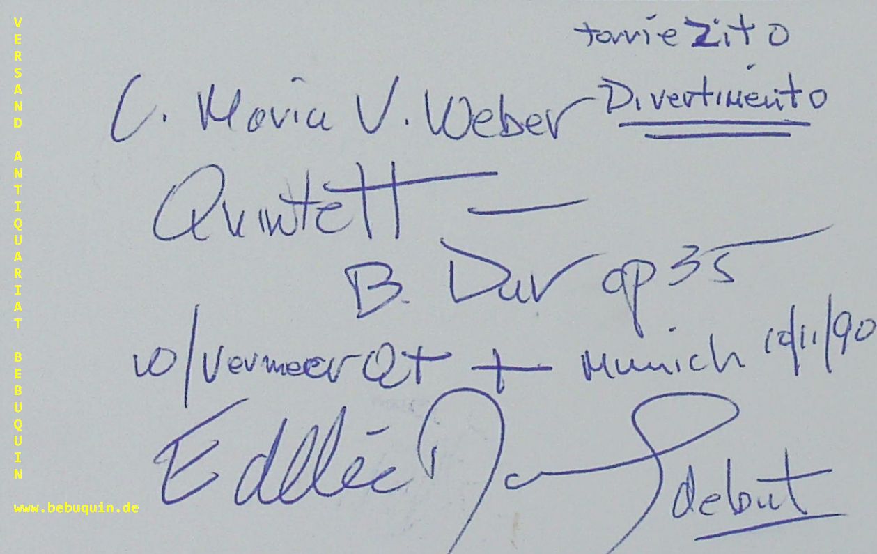 JAZZ.– DANIELS, Eddie (Klarinettist) eigenhändig signierte und datierte Autogrammkarte. München Debut. München 10.11.1990. 8 x 12,5 cm. Karteikarten. Eddie Daniels (* 19. Oktober 1941 in New York City) ist ein US-amerikanischer Klarinettist, der sich sowohl als Jazzmusiker als auch als Interpret klassischer Musikwerke einen Namen machte. (Wikipedia)