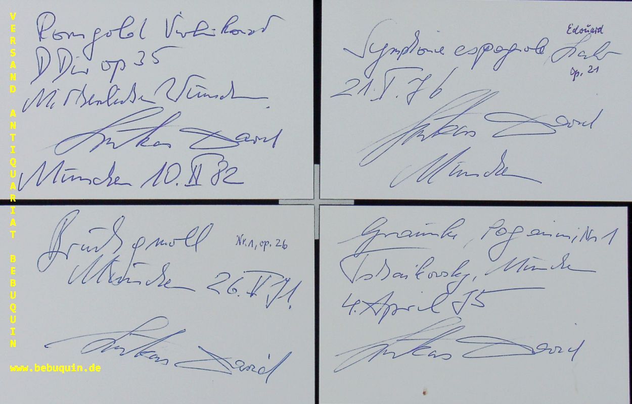 DAVID, Lukas (Violinist): 4 eigenhändig signierte und datierte Autogrammkarten: Mit herzlichen Wünschen. München 1971 – 1982. 8 x 12,5 cm. 2 Karteikarten. Lukas Florian David (* 5. Juni 1934 in Wels) ist ein österreichischer Violinist. (Wikipedia)
