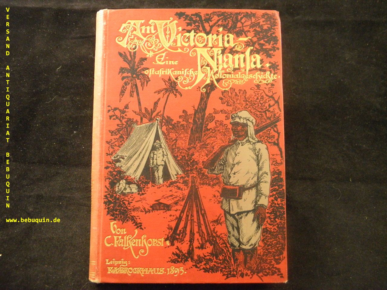 KOLONIEN.– FALKENHORST, C.: Am Victoria – Njansa. Eine ostafrikanische Kolonialgeschichte. 2. Aufl. Leipzig (Brockhaus), 1893. VI, 174 (2) S. mit 41 Abb. ill. OLn. Rücken geblichen, feines Ex. Klotz 1394/28.
