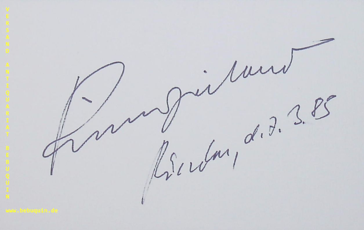 FISCHER-DIESKAU, Dietrich (Bariton): eigenhändig signierte und datierte Autogrammkarte. München (Philharmonie), 7.3.1985. 8 x 12,5 cm. Karteikarte. Dietrich Fischer-Dieskau (* 28. Mai 1925 in Berlin; † 18. Mai 2012 in Berg) war ein deutscher Sänger (Bariton), Dirigent, Maler, Musikschriftsteller und Rezitator. Fischer-Dieskau gilt als einer der bedeutendsten Lied- und Opernsänger des 20. Jahrhunderts. Mit über 400 Schallplatten ist er der Sänger, von dessen Interpretationen die meisten Einspielungen auf Tonträgern überhaupt existieren dürften.. (Wikipedia)