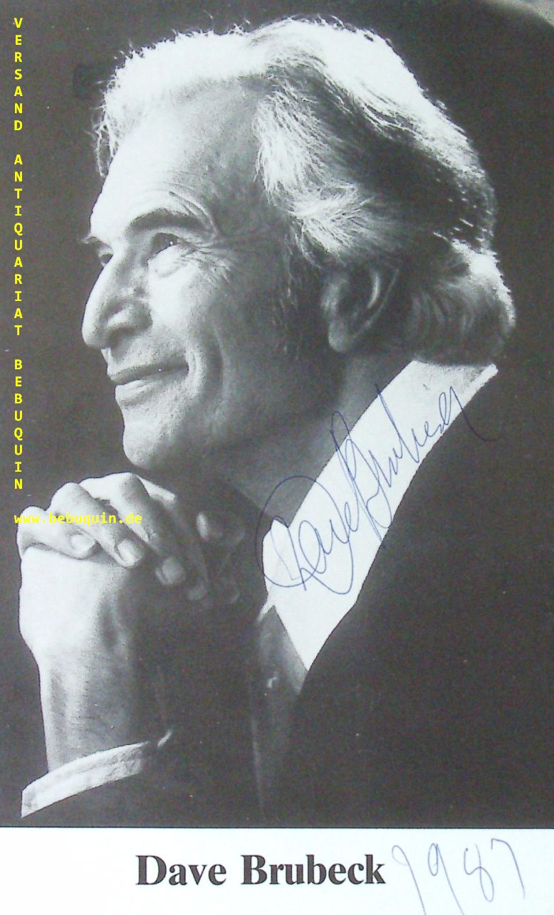 JAZZ.– BRUBECK, Dave (Pianist): eigenhändig signierter und datierter Portraitausschnitt. München (Philharmonie), 14.10.1987 19 x 12 cm. Zeitungsausschnitt mit Brubeckportrait. David Warren „Dave“ Brubeck (* 6. Dezember 1920 in Concord, Kalifornien; † 5. Dezember 2012 in Norwalk, Connecticut) war ein US-amerikanischer Jazzpianist, Komponist und Bandleader. Er leitete mit seinem Quartett eine der langlebigsten und erfolgreichsten Combos des Modern Jazz und eroberte dem Jazz mit der intellektuellen Mittelschicht ein neues Publikum. (Wikipedia)