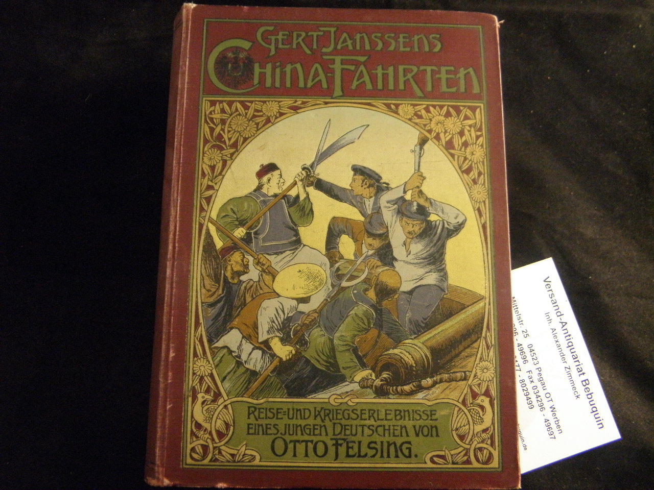 FELSING, Otto: Gert Janssens China-Fahrten. Reise- und Kriegselebnisse eines jungen Deutschen. München (Lehmanns), (1909). Gr. 8°. 464, 24 S. mit zahlreichen Abbbildungen nach photogr. Aufnahmen und nach Originalzeichnungen von Maler Anton Hoffmann. ill. OLn. Kanten leicht berieben, sonst von guter Erhaltung. = Julius Lohmeyers Vaterländische Jugendbücherei, Bd. 14. seltene EA. Klotz 1436/4.