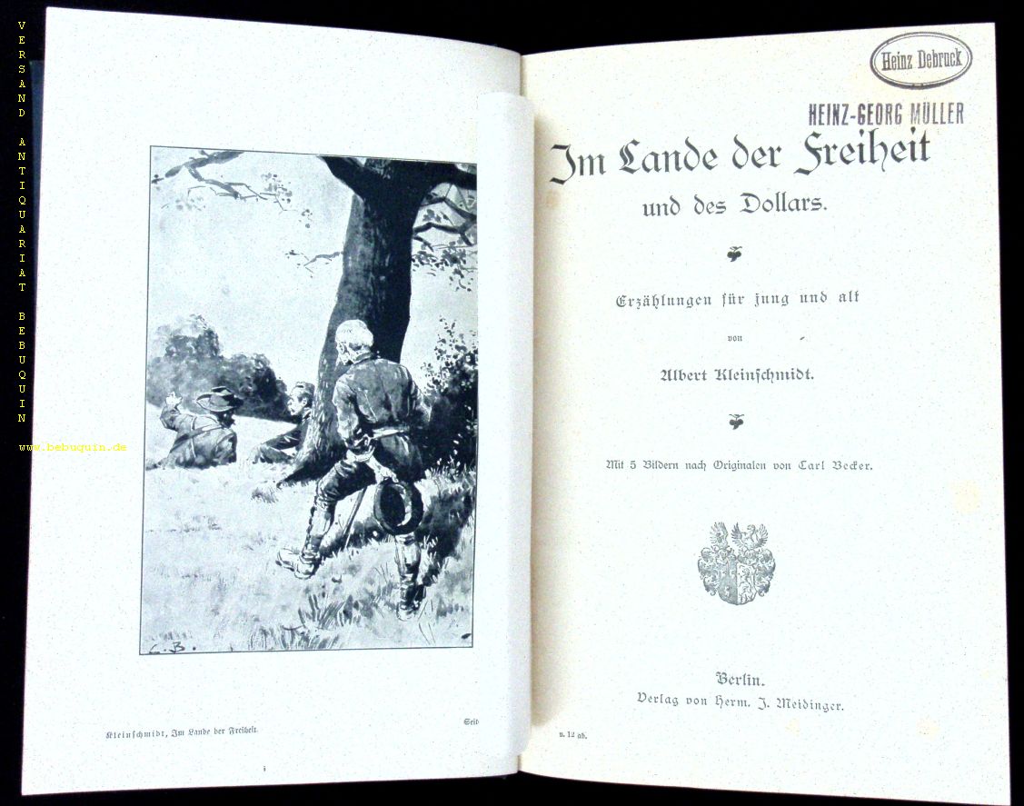 KLEINSCHMIDT, Albert: Im Lande der Freiheit und des Dollars. Erzählungen für jung und alt. Berlin (Meidinger), (1896). Gr. 8°. III, 206 S. mit 5 Bildern von Carl Becker. farb. ill. blaues OLn. NaT, feines Ex. EA. Klotz 3449/22.
