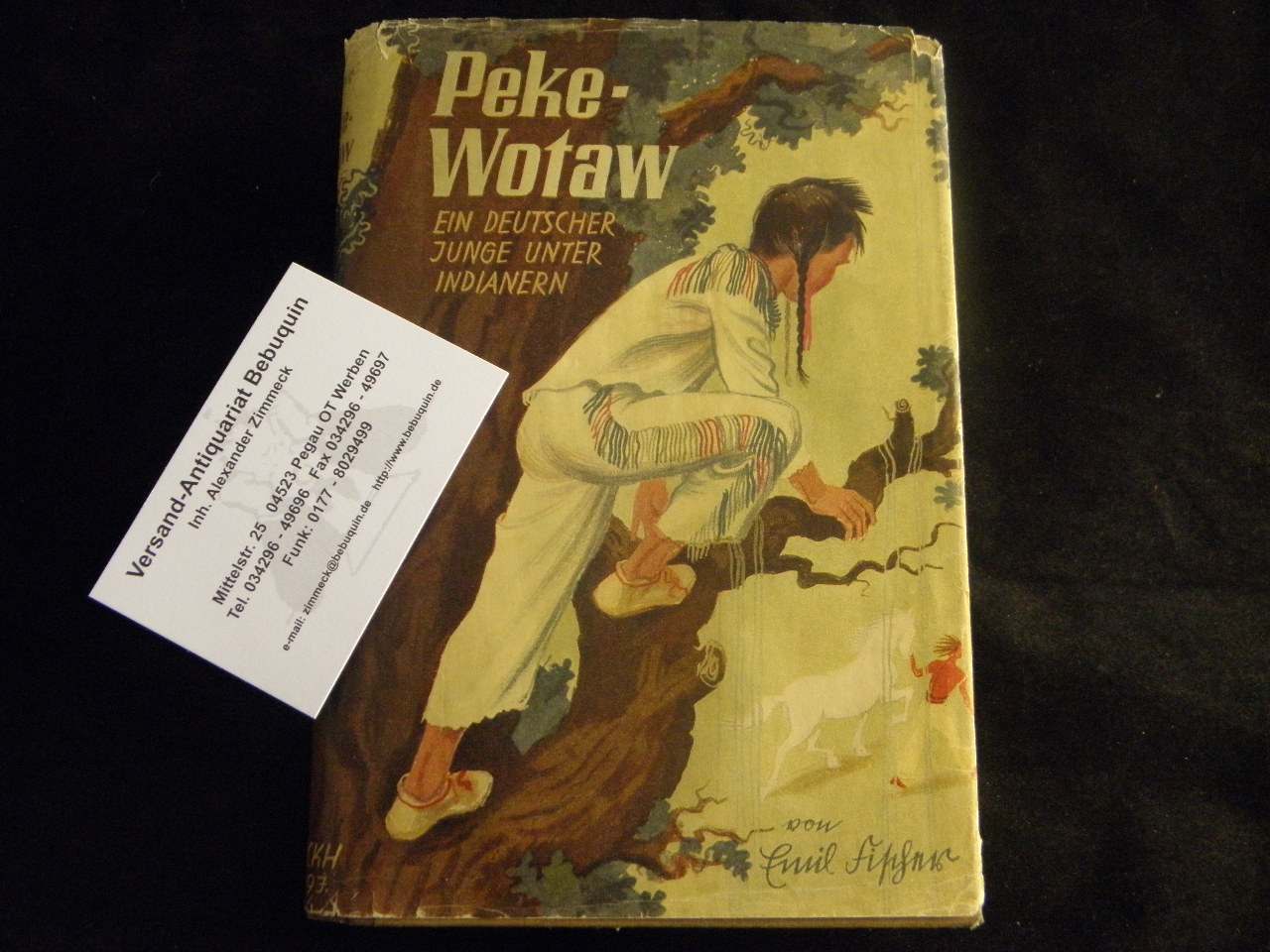FISCHER, Emil: Peke Wotaw. Ein deutscher Junge unter Indianern älteren und neueren Quellen nacherzählt. 11.– 17 Tsd. Stuttgart (Franckh), 1940. 152 S. mit zahlr. Textabb. von Karl Staudinger, 8 Tafelbildern + einer Übersichtskarte. ill. OHLn. mit OUmschl. NaV, gutes Ex. Klotz 1481/2.