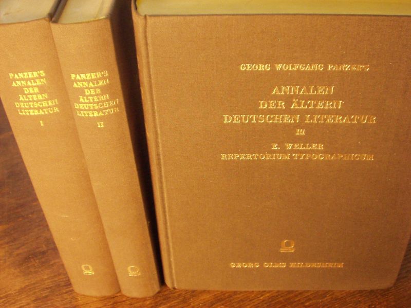 INKUNABELN.– PANZER, Georg Wolfgang: Annalen der älteren deutschen Literatur M.D. – M.D.XXVI. Emil Weller: Die deutsche Literatur im ersten Viertel des 16. Jahrhunderts. Reprint der Ausgbe 1864. 3 Bände. Hildesheim (Olms), 1961. Gr. 8°. ca 1500 S. OLn. Wichtiger Standardtitel.