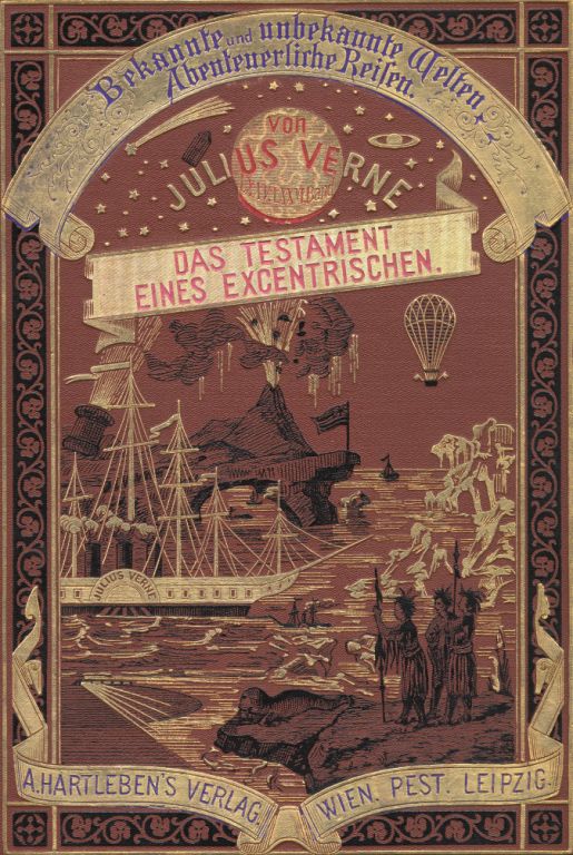 VERNE, Julius: Das Testament eines Excentrischen. 2 Teile in 1 Bd. Wien (Hartleben), 1900. Gr. 8°. 480 S. mit 81 Illustrationen. OLn. mit reicher Gold- und Schwarzprägung und Farbschnitt. ungewöhnlich schönes Ex. = Bekannte und unbekannte Welten, Bd. 75 + 76. dt. EA. Prachtausgabe. Fromm 26376.