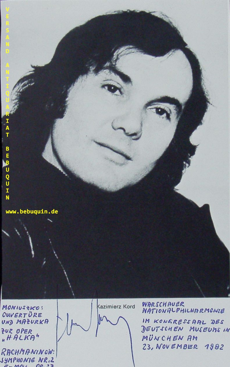 KORD, Kazimierz (Dirigent): eigenhändig signiertes und datiertes Portrait aus Programmheft. Mit der Warschauer Nationalphilharmonie. München (Kongresssaal), 23.11.1982. 21 x 13 cm. 1 Bl. Kazimierz Kord (born 18 November 1930) is a Polish conductor. Between 1949 and 1955, he studied piano at the Leningrad Conservatory. He also studied at the Academy of Music in Kraków. (Wikipedia)