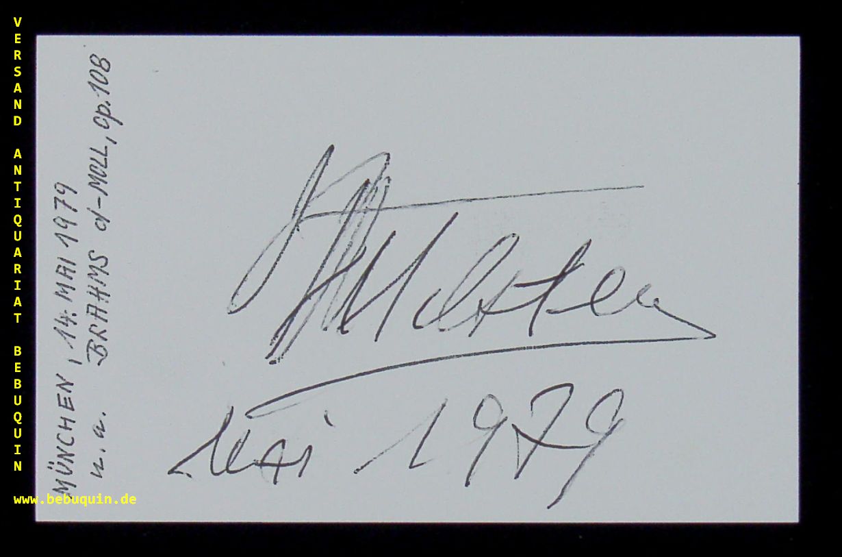 MILSTEIN, Nathan (Violinist): eigenhändig signierte und datierte Autogrammkarte. München, 14.5.1979. 8 x 12,5 cm. Karteikarte. Nathan Milstein (* 31. Dezember 1903 † 21. Dezember 1992 in London) war ein amerikanischer Violinist ukrainischer Herkunft. Er gilt als einer der größten Geiger des 20. Jahrhunderts. (Wikipedia)
