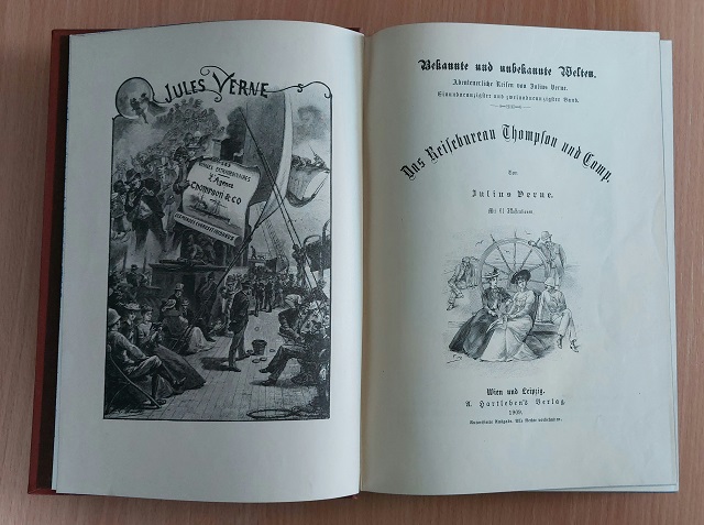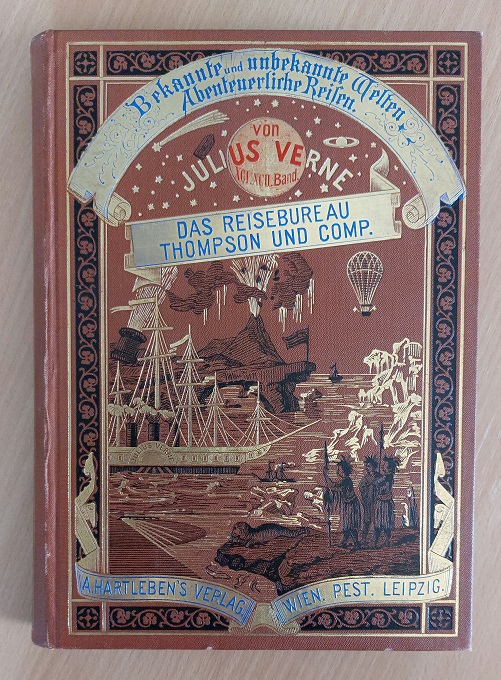 VERNE, Julius: Das Reisebureau Thompson und Comp. 2 Teile in 1 Bd. Wien (Hartleben), 1909. Gr. 8°. 487 S. mit 61 Illustrationen. OLn. mit reicher Gold- und Schwarzprägung sowie Farbschnitt. fast neuwertig. = Bekannte und unbekannte Welten, Bd. 91-92. dt. EA. Prachtausgabe. Fromm 26376.