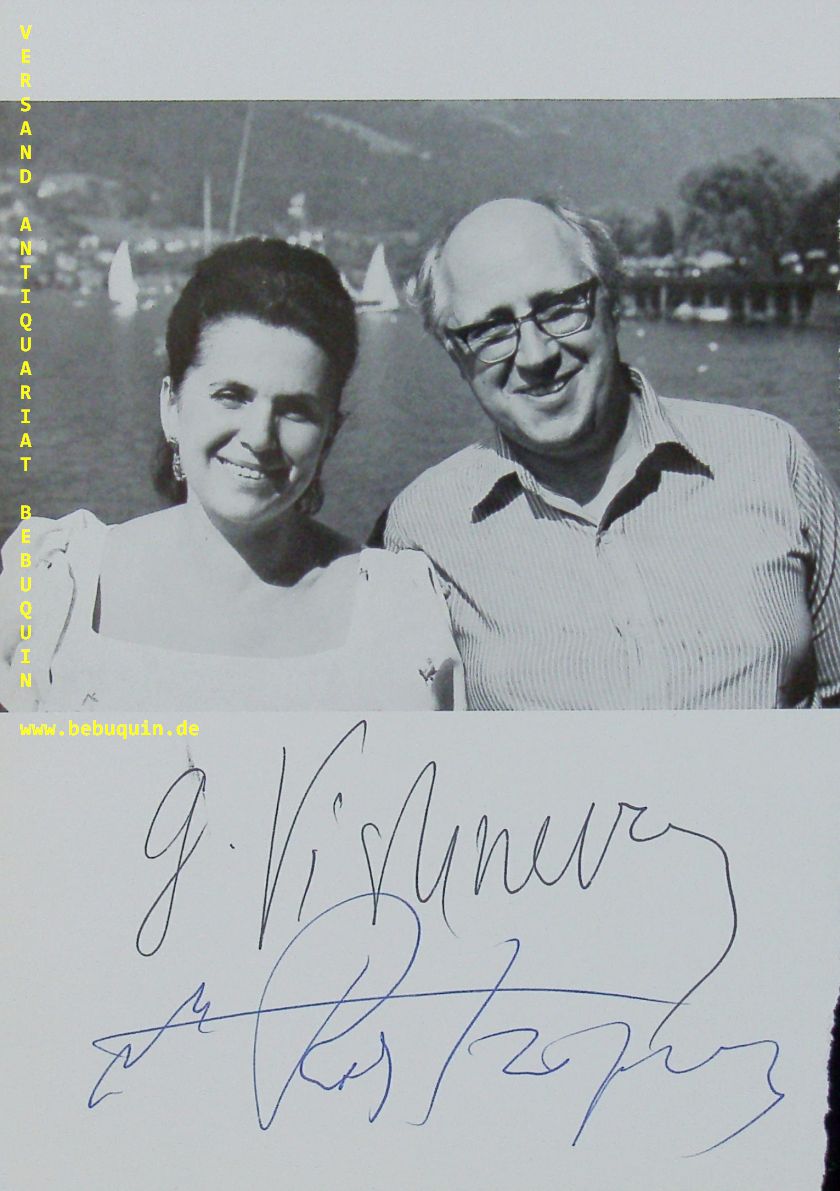 POSTROPOWITSCH, Mstislaw (Cellist) + WISCHNEWSKAJA, Galina (Sopran): eigenhändig von beiden signiertes Foto. München (Herkulessaal), 23.11.1974. 21 x 14,5 cm. 3 Bl. Galina Pawlowna Wischnewskaja (* 25. Oktober 1926 in Leningrad; † 11. Dezember 2012 in Moskau) war eine russische Opernsängerin (lyrischer bis dramatischer Sopran, ursprünglich Operettensopran). Sie war seit 1955 die Gattin des Cellisten und Dirigenten Mstislaw Leopoldowitsch Rostropowitsch, mit dem sie zwei Töchter hatte. (Wikipedia)