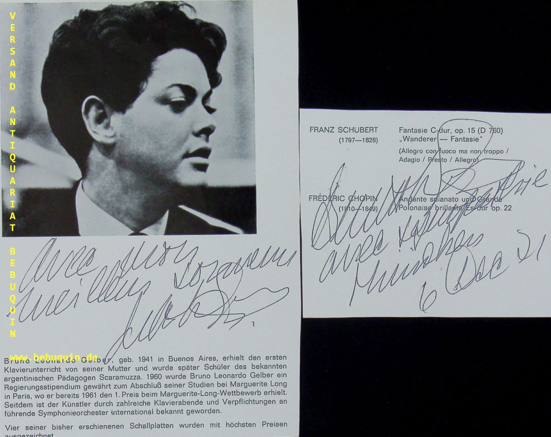 GELBER, Bruno Leonardo (Pianist): 2 eigenhändig signierte und datierte Programmheftausschnitte. München (Herkulessaal), 6.12.1971. 19 x 13 cm. 2 Bl. Bruno Leonardo Gelber (* 19. März 1941 in Buenos Aires) ist ein argentinischer Pianist. (Wikipedia)