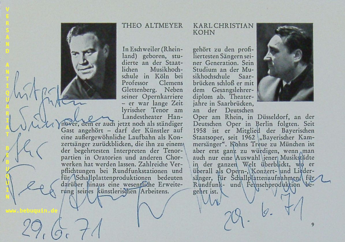 ALTMEYER, Theo (Tenor) + KOHN, Karl Christian (Bass): 2 eigenhändige Signaturen auf Programmheft. München, 29.6.1991. Quer kl 8°. 1 Bl. Theodor Daniel Altmeyer (* 16. März 1931 in Eschweiler, Rheinland; † 28. Juli 2007 in Hannover) war ein deutscher Opernsänger (Tenor) und Gesangspädagoge. Karl-Christian Kohn (* 21. Mai 1928 in Losheim am See, Saarland; † 20. Januar 2006 in München) war ein deutscher Opernsänger (Bass). (Wikipedia)