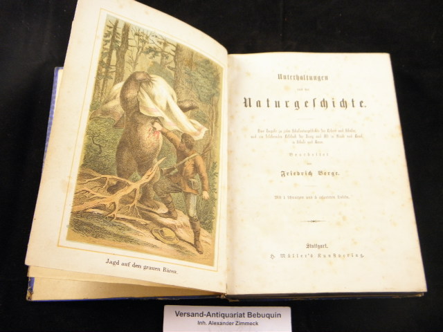 NATURKUNDE.– BERGE, Friedrich: Unterhaltungen aus der Naturgeschichte. Eine Zugabe zu jeder Schulnaturgeschichte für Lehrer und Schüler, und ein belehrendes Lesebuch für Jung und Alt in Szadtz und Land, in Schule und Haus. Stuttgart (Müller), ca 1860. IX, 310 S. + 1 schwarze und 5 colorirte Tafeln. Pb der Zeit mit silbergeprägtem Wappen auf dem Deckel. Kanten berieben, vereinzelt stockfleckig, WaV, ordnungsgemäß ausgesondertes Bibliotheksexemplar (Rückenschild, Stempel). EA.