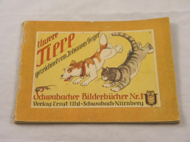 GEYER, Johannes: Unsere Tiere. Nürnberg (Uhl), ca 1940. Quer 8°. 8 Bl. mit farb. Bildtafeln. farb. ill. OKart. Rücken etwas berieben, Rückdeckel angeschmutzt, insgesamt gut. = Schwabacher Bilderbücher Nr. 1. seltenes Bilderbuch.