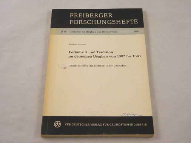 BERGBAU.– WÄCHTLER, Eberhard: Fortschritt und Tradition im deutschen Bergbau von 1807 bis 1848. Studien zur Rolle der Tradition in der Geschichte. Leipzig (Grundstoffindustrie), 1970. 118 S. mit 4 Tabellen. ill. Okart. gutes Ex. = Freiberger Forschungshefte D 68. EA.