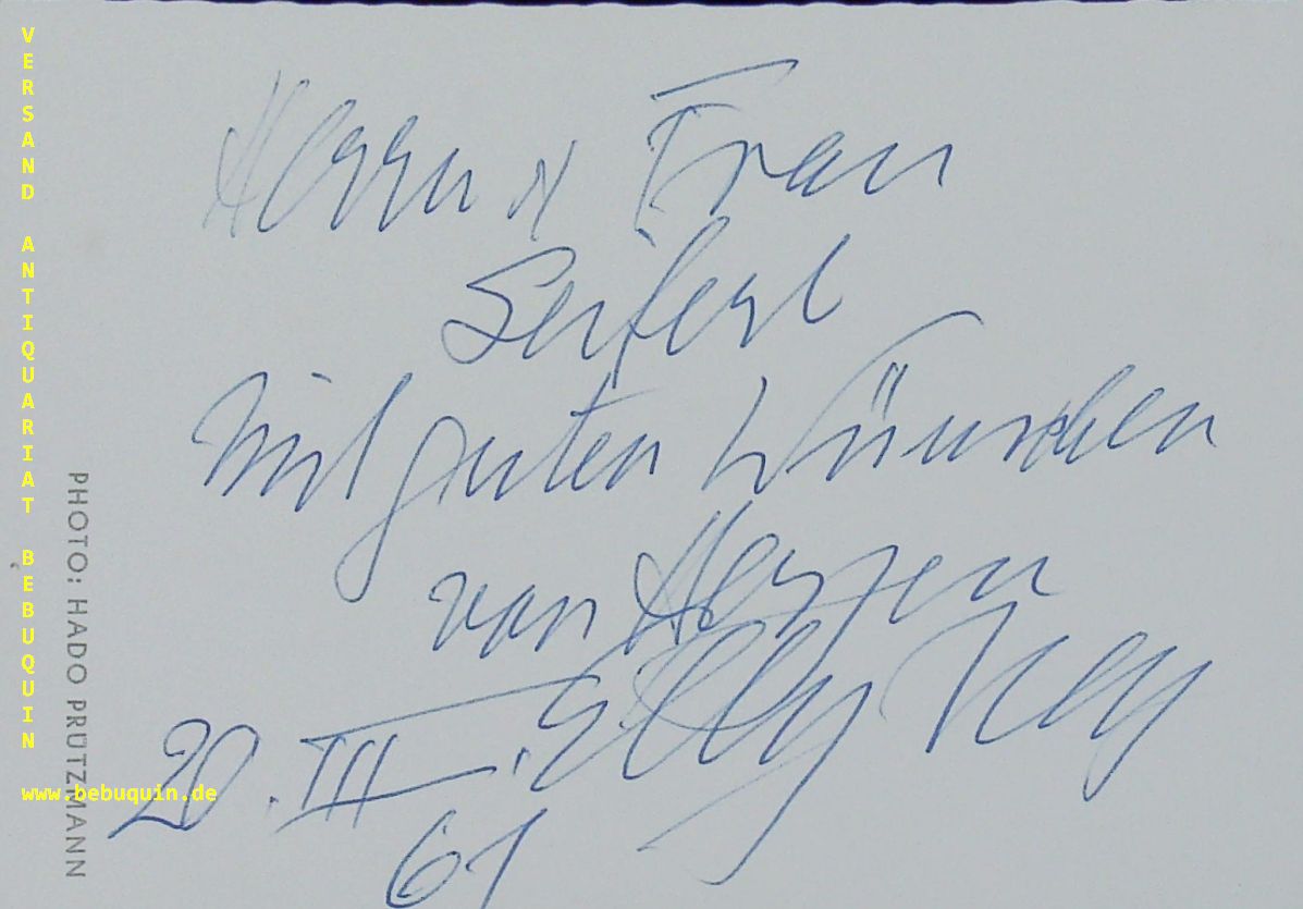NEY, Elly (Pianistin): eigenhändig signiertes und datiertes Foto von Hado Prützmann mit 6zeiliger persönlicher Widmung an Willi Seifert. o.O, 20.3.1961. 15 x 10 cm. s/w Foto. Elly Ney (* 27. September 1882 in Düsseldorf; † 31. März 1968 in Tutzing) war eine deutsche Pianistin, die als Interpretin des klassisch-romantischen Repertoires, besonders der Klavierwerke Ludwig van Beethovens, international anerkannt war. Nach 1933 trat sie aktiv für die nationalsozialistische Ideologie ein und ließ sich als Künstlerin von den Machthabern für deren Zwecke instrumentalisieren. Diese Haltung führte nach dem Zweiten Weltkrieg immer wieder zu kontrovers geführten, öffentlichen Diskussionen über ihre Person. (Wikipedia)