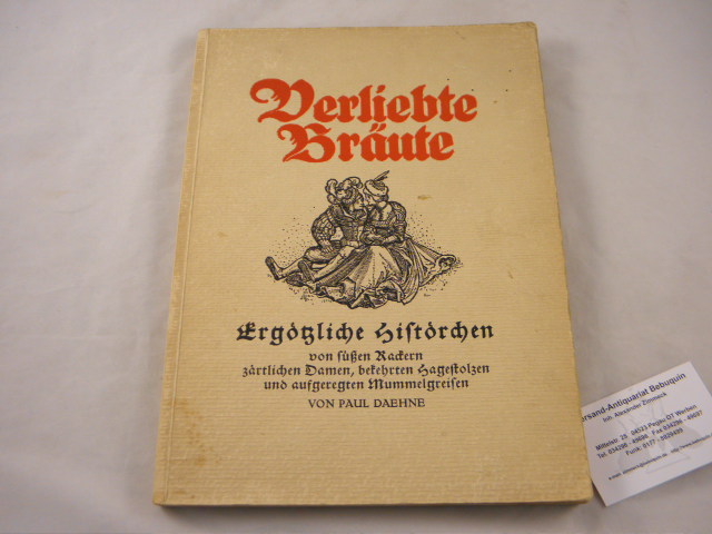 DAEHNE, Paul: Verliebte Bräute. Ergötzliche Histörchen von süßen Rackern, zärtlichen Damen, bekehrten Hagestolzen und aufgeregten Mummelgreisen. Leipzig (Weigel), ca 1930. 4°. 180 S. mit zahlr. Bildern aus der Sammlung des Verfassers. ill. OKart. leicht gebräunt. EA.