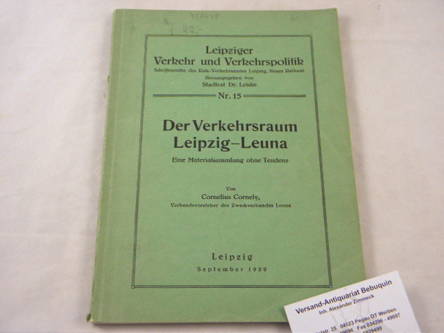 LEIPZIG.– CORNELY, Cornelius: Der Verkehrsraum Leipzig – Leuna. Eine Materialsammlung ohne Tendenz. Leipzig, 1929. 4°. 92, 2 S. mit Textabb, Karten + fotografischen Bildtafeln. OKart. gutes Ex. = Leipziger Verkehr und Verkehrspolitik, Nr. 15.