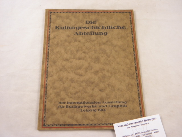 LEIPZIG.– KULTURGESCHICHTLICHE ABTEILUNG.– Organisation, Arbeitsplan und Mitgliederliste. Leipzig (Internationale Buchgewerbeausstellung), 1914. 4°. 48 S. mit 1 Grundriss. OKart. feines Ex.