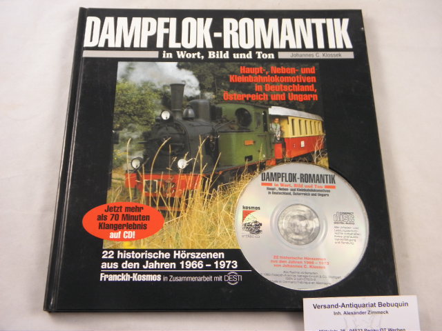EISENBAHN.– KLOSSEK, Johannes C.: Dampflok-Romantik in Wort, Bild und Ton. Haupt-, Neben- und Kleinbahnlokomotiven in Deutschland, Österreich und Ungarn. Stuttgart (Kosmos), 1996. 4°. 44 S. mit zahlr. Bildern + 22 historischen Hörszenen aus den Jahren 1966 – 1973 auf CD. OPb. mit CD. tadellos. EA.