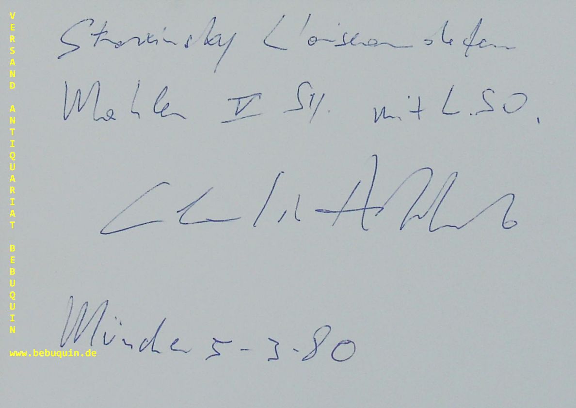 ABBADO, Claudio (Dirigent): eigenhändig signierte und datierte Autogrammkarte. München, 5.3.1980. 10,5 x 14,5 cm. große Karteikarte. Claudio Abbado (* 26. Juni 1933 in Mailand; † 20. Januar 2014 in Bologna) war ein italienischer Dirigent. Er war ständiger Gastdirigent der Wiener Philharmoniker (ab 1971) sowie Chefdirigent der Mailänder Scala (ab 1971), des Londoner Sinfonieorchesters (1979–1986), der Wiener Staatsoper (1986–1991) und der Berliner Philharmoniker (1989–2002). (Wikipedia)