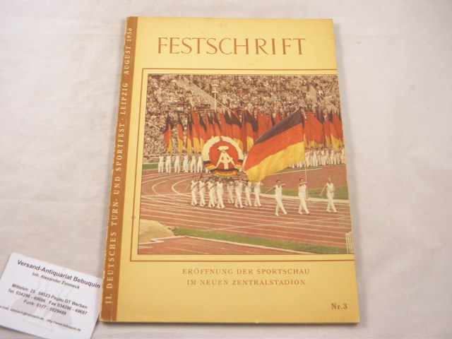 LEIPZIG.– FESTSCHRIFT 2. DEUTSCHES TURN- UND SPORTFEST.– August 1956. Eröffnung der Sportschau im neuen Zentralstadion. Hrsg. von Wofgang Böttner u.a. Leipzig (Graphische Werkstätten), 1956. 4°. 80 S. mit ca 150 S/W Fotos. farb. ill. OKart. etwas gebräunt, WaV.