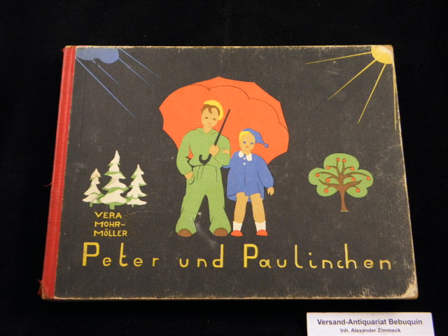 MOHR-MÖLLER, Vera: Peter und Paulinchen. Ein Bilderbuch. Verse unter Mitarbeit von Liesel Waldbauer. Hamburg (Ellermann), 1940. Quer 4°. 6 Kartonblätter mit je 1 Vierzeiler am unteren Bildrand der ganzseitigen Farbillustrationen von V. Mohr-Möller. farb. ill. OHLn. gutes Ex. EA. Klotz, Bilderbücher II, 3783/4. Raecke-Hauswedell, Hamburg 125.