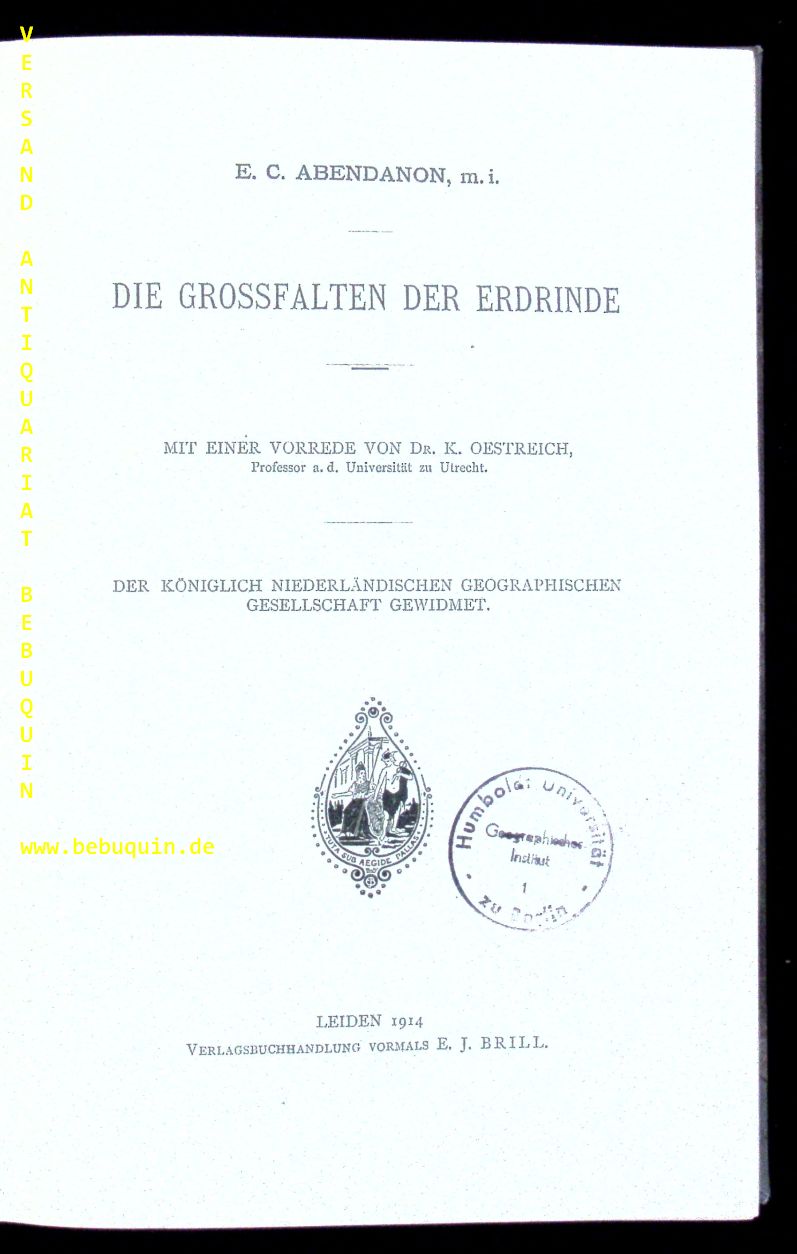 GEOLOGIE.– ABENDANON, Eduard Cornelius: Die Grossfalten der Erdrinde. Mit einer Vorrede von K. Oestreich. Leiden (Brill), 1914. Gr. 8°. X, 183 S. HLn der Zeit. makuliertes Bibliotheksex. EA.