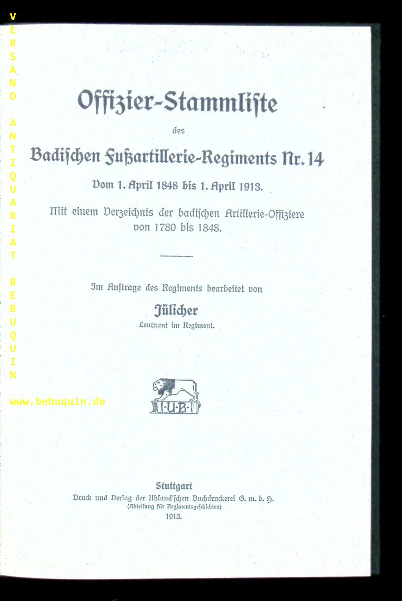 REGIMENTER.– JÜLICHER: Offizier-Stammliste des Badischen Fußartillerie-Regiments Nr. 14. Vom 1. April 1848 bis 1. April 1913. Mit einem Verzeichnis der badischen Artillerie-Offiziere von 1780 bis 1848. Stuttgart (Uhland), 1913. Gr. 8°. 152 (2) S. ill. OPb. tadellos. EA.