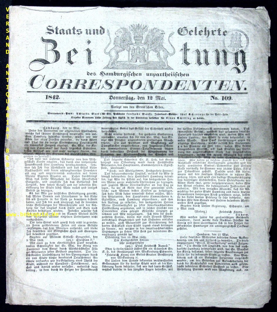 HAMBURG.– STAATS-UND GELEHRTE ZEITUNG NR. 109.– des Hamburgischen unpartheyischen Correspondenten. Anno 1842. Am Donnerstag, den 12. Mai. Hamburg (Erben), 1842. 4°. 4 Bl. mit Kopfvignette. OBr. etwas gebräunt und bestaubt, unaufgeschnitten. Enthält Nachrichten vom großen Brand in Hamburg am selben Tag.